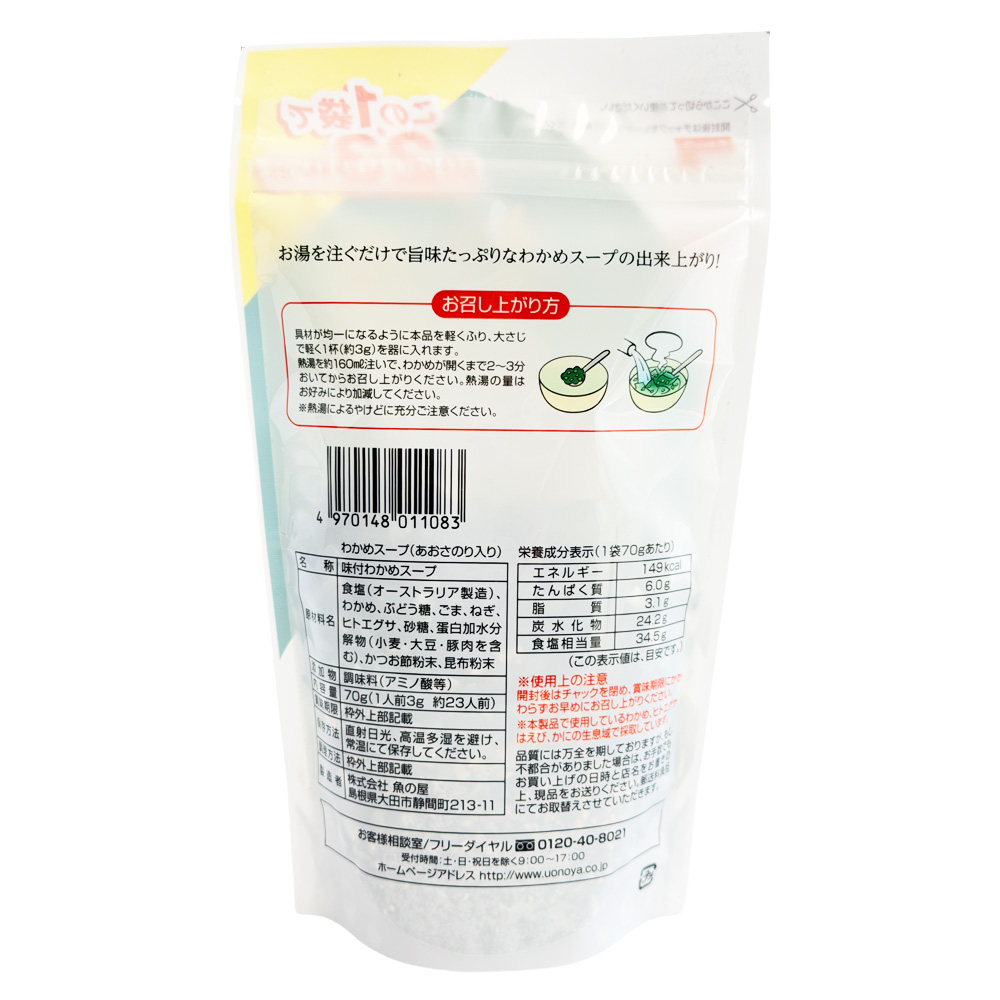 食塩(オーストラリア製造)、わかめ、ぶどう糖、ごま、ねぎ、ヒトエグサ、砂糖、蛋白加水分解物(小麦・大豆・豚肉を含む)、かつお節粉末、昆布粉末